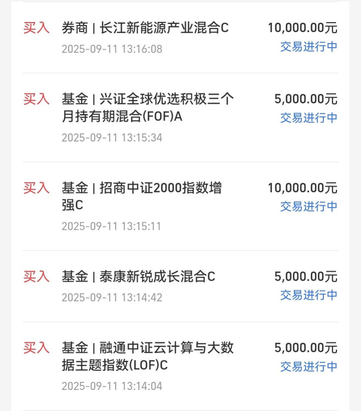 加仓5000“$泰康新锐成长混合C$(017366)”。我今天投一次科技、新能源、黄金混合基,这个基是我之前把银行板块转过来的,躲过了银行的下跌,同时吃了一波大肉。此外,这个基金原本重仓科技的,但是前段时间科技调整了,该基金也提前调仓部分去新能源和黄金了,不但避免了大跌,而且收益还创新高了,基金经理的实力还是很强的。目前,大头累计投了13万,赚了14个点,感觉非常好。今天虽然CPO大涨,但是我依然看好新能源和黄金方向,毕竟科技发展尽头是能源供应,至于黄金主要看好美联储降息后的上涨。所以我今天大加仓一次,强烈看好后市表现。